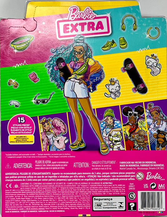 Barbie Extra Doll #4, Curvy, in Zippered Bomber Jacket with 2 Pet Kittens, Extra-Curly Blue Hair, Layered Outfit & Accessories Including Skateboard, Multiple Flexible Joints, For Kids 3 Years Old & Up