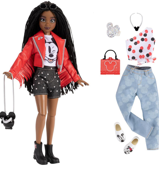 Fashion Dolls Disney 100 - Mickey Mouse 11.5" Tall with 13 Points of Articulation, Two Complete Mix-and-Match Outfits and Glittery Mickey Ring for You!