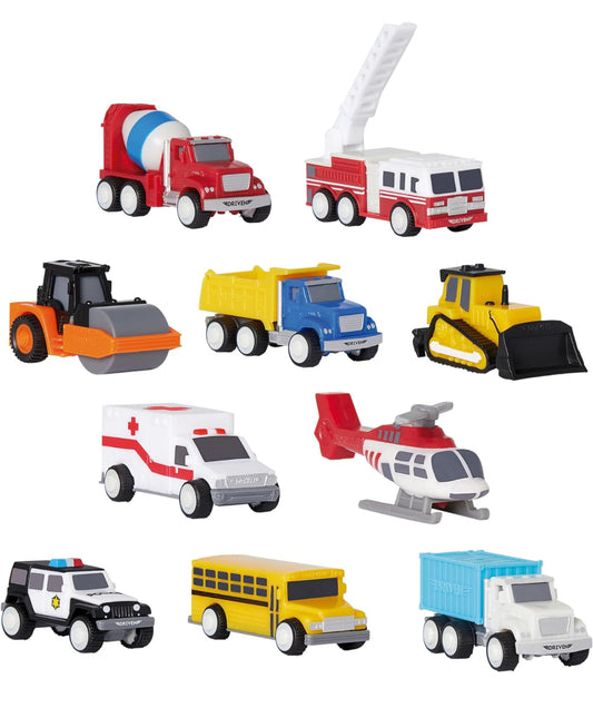 Driven by Battat – Pocket Fleet 1 (10 Pack) – Mini Cars Toys – Police Car, Helicopter, Fire Truck, Ambulance, School Bus, Dump Truck, Bulldozer & More Small Construction Vehicles – Gift for Age 3+