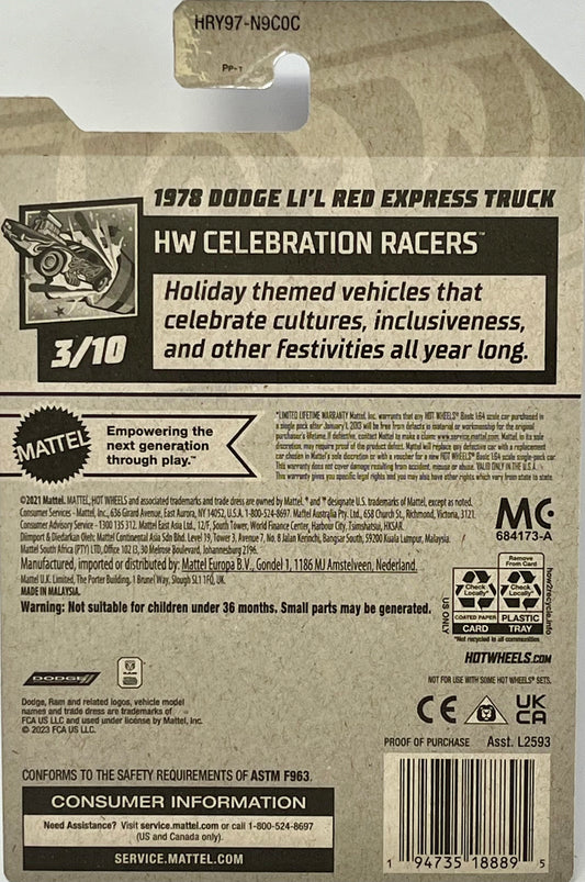 Hot Wheels 1978 Dodge Li'l Red Express Truck, HW Celebration Racers 3/10 [red] 53/250