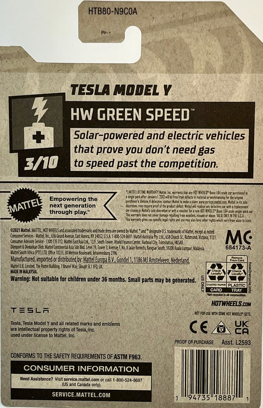 Hot Wheels Tesla Model Y Blue 15/250 HW Green Speed 3/10