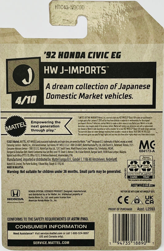 Two Hot Wheels Red '92 Honda Civic EG (#4/10) J-Imports