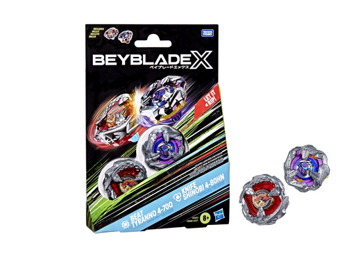 Experience the thrill of the next generation of Beyblade stadiums, launchers and tops: Beyblade X with the Beyblade X Beat Tyranno 4-70Q & Knife Shinobi 4-80HN Dual Pack Set which includes 2 right-spinning tops (Beystadium and launchers required, sold separately). Launch right into battle or reconfigure the interchangeable blade, ratchet, and bit of this Booster Pack with those of other Beyblade X tops (sold separately) to create your own unsurpassable top. Beyblade X features the X-Celerator Gear System innovation to level-up your game.