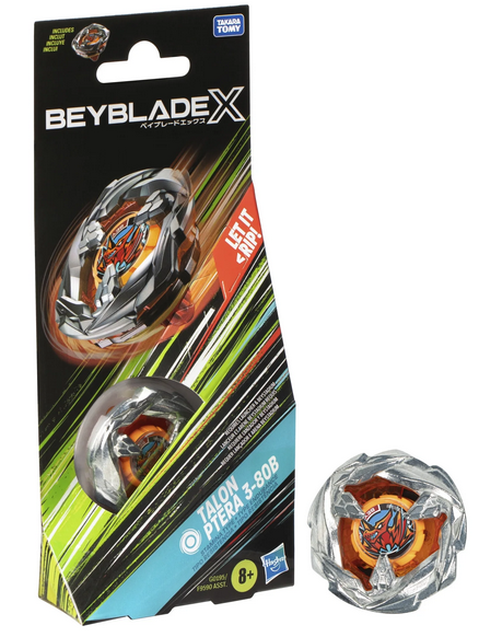 - HARNESS THE POWER: Includes Takara Tomy-designed Beyblade X top with authentic die-cast metal parts: Talon Ptera 3-80B Right-Spin Stamina Type. The downward pointing blades slow your opponent s speed giving your stamina time to outlast them