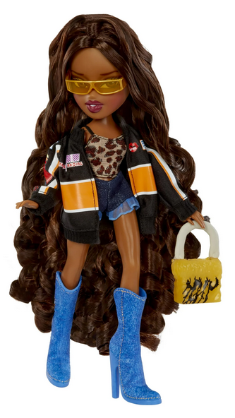 DRESS TO XPRESS: Sasha’s friends call her “Bunny Boo” because old school hip hop is her thing. She’s looking forward to a day of hangin’ with her girls, and xpressing her street couture style. GOIN’ OUT FASHIONS: Sasha wears an orange and black racing racket layered over a fierce leopard print tank top. Her ruffled denim shorts match her denim cowboy boots, all coming together in a super stylin’ look. ACCESORIZE: Sasha comes with a yellow bucket purse and matching sunglasses. DAZZLING PACKAGING: Stunning packaging shining with style and personality. Featuring metallic letters and magazine-style questions answered by your faves.INCLUDES: Bratz fashion doll with outfit, purse, sunglasses, and brush.
