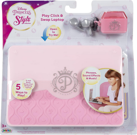 Sleek unique and oh so fun, the Disney Princess Style Collection combines everyday play with a contemporary Disney Princess flair. This collection of real-life inspired toys is meant for the modern girl with big goals and great style. She's a go-getter, a globe-trotter, a fashionista, and most of all, a girl who sets her own trends! Get ready to take on the world with the Disney Princess Style Collection! Sleek, chic and oh so fun, this modern Disney Princess Style Collection Play Click & Swap Laptop provides an engaging, realistic and fun play experience. With five different modes of play, you’ll have so much fun pretending to email, chat and shop your favorite Disney Princesses! Each button on the keyboard independently clicks providing a realistic play experience in free play mode, while the remaining four modes are determined by the F key icons and include music, shopping, email and video chat! The two included double-sided screen cards match the play modes and can be switched in and out for endless fun. Smart phrases and sound effects will also keep you connected with favorite Disney Princesses! Decorate your laptop with the stickers provided and wear the play wireless ear buds to show off your modern high tech look!
