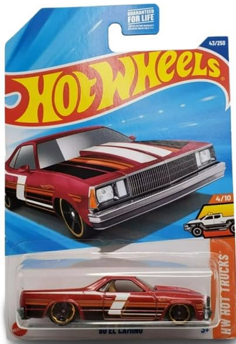 Rev up your collection with this stunning 1:64 scale diecast replica of the '80 El Camino from Hot Wheels' HW Hot Trucks series. As the fourth release in the Hot Trucks collection, this meticulously detailed model captures the unique car-truck hybrid styling that made the El Camino a legend. The die-cast metal construction ensures durability while preserving the authentic proportions and distinctive features of the 1980 model year. Perfect for both play and display, this miniature showcases the El Camino's signature flowing lines and utility-meets-style design that car enthusiasts love. Whether you're a serious collector expanding your Hot Wheels lineup or introducing a young fan to classic automotive history, this Hot Trucks edition El Camino brings the spirit of this iconic vehicle to life in perfect miniature form.