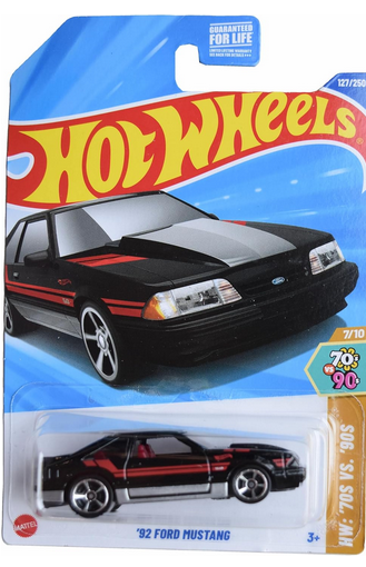 The '92 Ford Mustang 127/250 Hot Wheels 2025 HYY68 HW 70s vs 90s 7/10 in black is a diecast car model featuring the iconic Ford Mustang design from 1992. This 1:64 scale model is part of the Hot Wheels series and showcases the Mustang character family.