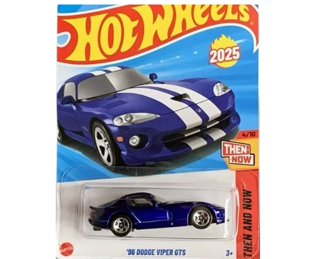 Experience the thrill of the iconic '96 Dodge Viper GTS with this stunning 1:64 scale die-cast model from Hot Wheels. Part of the Then & Now series (4/10) and numbered 176/250, this blue beauty captures the sleek, aggressive styling that made the Viper a legend. Crafted with meticulous attention to detail in die-cast metal construction, this collectible car brings the power and presence of the original to your display case. Perfect for collectors and enthusiasts aged 3 and up, this manually operated model comes packaged in a protective box. The car's compact size - with packaging dimensions of 7 x 5 x 3 inches - makes it ideal for both play and display. Note that small parts are present, making adult supervision recommended for younger children.