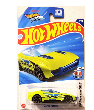 Hit the streets with the Hot Wheels Alpha Pursuit, a high-tech police cruiser built for high-speed action. This 1:64 scale die-cast model blends futuristic design with law enforcement style, featuring a low-profile body, aerodynamic lines, and bold police graphics. With its performance-inspired stance, Alpha Pursuit is ready to chase down the competition on any Hot Wheels track.Whether you're building a fleet of emergency vehicles or love fast-paced play, Alpha Pursuit brings cutting-edge pursuit power to your collection.
