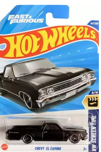 Add this sleek black Chevy El Camino to your Hot Wheels collection! Part of the Screen Time series (9/10) and numbered 147/250, this 1:64 scale die-cast car captures the iconic styling of the classic El Camino in stunning detail. The vehicle features the signature muscle car front end combined with the practical utility bed that made the El Camino a unique part of automotive history. This precision-crafted model showcases excellent craftsmanship with its glossy black finish and authentic proportions. Perfect for both play and display, this Hot Wheels die-cast car makes an excellent addition to any collector's showcase or child's racing adventures. As part of the Screen Time collection, this El Camino represents vehicles that have made memorable appearances in movies and television shows.