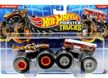Dive into fiery head-to-head action with the Hot Wheels Monster Trucks Demolition Doubles featuring Tiger Shark vs. 5 Alarm! This 1:64 scale 2-pack delivers double the destruction with two fierce rivals ready to battle it out in monster truck mayhem. Tiger Shark strikes with wild animal instincts and aquatic-inspired power, while 5 Alarm, the fire truck-themed beast, brings blazing speed and rescue-ready muscle to the arena. With massive wheels, rugged builds, and bold designs, these two are built for non-stop crashing fun.