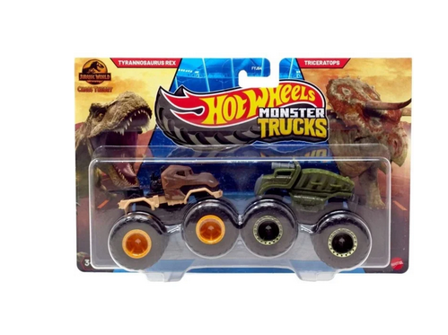 Unleash prehistoric power with the Hot Wheels Monster Trucks Tyrannosaurus Rex vs Triceratops Demolition Doubles! This 2-pack features two dino-themed monster trucks in fierce head-to-head battle—each in 1:64 scale with oversized wheels, rugged styling, and detailed dinosaur designs. Built for epic crashes and jaw-dropping stunts, these trucks bring the Jurassic to life in every smash-up. Whether you're collecting, racing, or crashing, this set is perfect for kids and Monster Trucks fans ready for wild prehistoric mayhem.