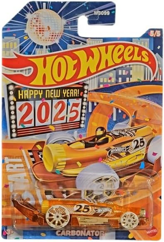 Celebrate the arrival of 2025 in high-octane style with the Hot Wheels Happy New Year Carbonator! This limited-edition 1:64 scale die-cast car is a must-have for collectors and thrill-seekers alike. With its sleek, aerodynamic design and vibrant colors, the Carbonator is sure to turn heads on the track or display shelf. Crafted with meticulous attention to detail, this miniature marvel captures the essence of speed and excitement. Whether you're a longtime Hot Wheels enthusiast or searching for the perfect gift, the Happy New Year Carbonator promises endless hours of automotive enjoyment. Embrace the spirit of the new year and add this electrifying piece to your collection today! Please note that this toy is intended for children aged 3 and up.