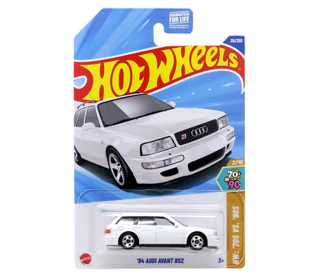 Step into the world of high-performance wagons with the Hot Wheels '94 Audi Avant RS2. Co-developed with Porsche, the original RS2 redefined what a family car could bedelivering blistering speed, Quattro all-wheel-drive grip, and everyday practicality. This 1:64 scale die-cast model perfectly captures the aggressive stance, flared arches, and distinctive detailing that made the RS2 a game-changer in the performance car world.A must-have for collectors and Euro car fans, the Audi RS2 Avant blends utility and performance in a sleek, iconic design.