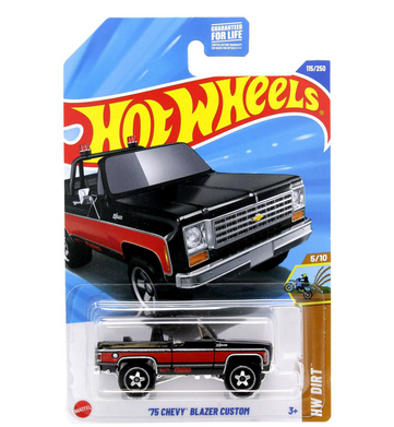 Classic utility meets lifted attitude with the Hot Wheels '75 Chevy Blazer Custom. This 1:64 scale die-cast model transforms the iconic mid-'70s SUV into a trail-blazing powerhouse, complete with a raised suspension, rugged off-road tires, and bold custom detailing. With its removable roof styling, aggressive stance, and eye-catching graphics, the Custom Blazer is ready to take on dirt, dunes, or display shelves.A must-have for collectors and off-road fans, this vintage Chevy brings retro 4x4 charm and custom flair to your Hot Wheels collection.