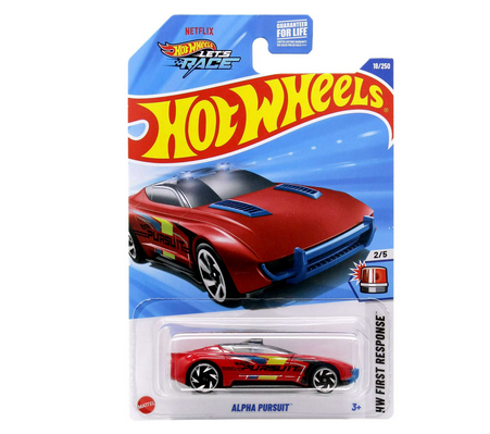 Hit the streets with the Hot Wheels Alpha Pursuit, a high-tech police cruiser built for high-speed action. This 1:64 scale die-cast model blends futuristic design with law enforcement style, featuring a low-profile body, aerodynamic lines, and bold police graphics. With its sleek black-and-white livery and performance-inspired stance, Alpha Pursuit is ready to chase down the competition on any Hot Wheels track.Whether you're building a fleet of emergency vehicles or love fast-paced play, Alpha Pursuit brings cutting-edge pursuit power to your collection.