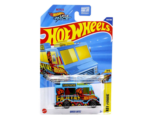The Hot Wheels "Quick Bite" is a food truck-themed toy car, part of the "Let's Race" series from the Netflix series. The "Quick Bite" is a delivery truck featuring a food theme and is designed for pull-back action.