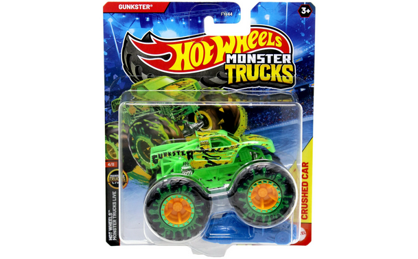The Hot Wheels Monster Trucks 1:64 scale die-cast trucks are the baddest trucks ever built for competition and ultimate dominance! They square off in head-to-head battles with their GIANT wheels! Every truck includes a collectible wheel and the package provides stats for each including name, truck type, strength, unique crash attack and motor-vation for great storytelling fun!