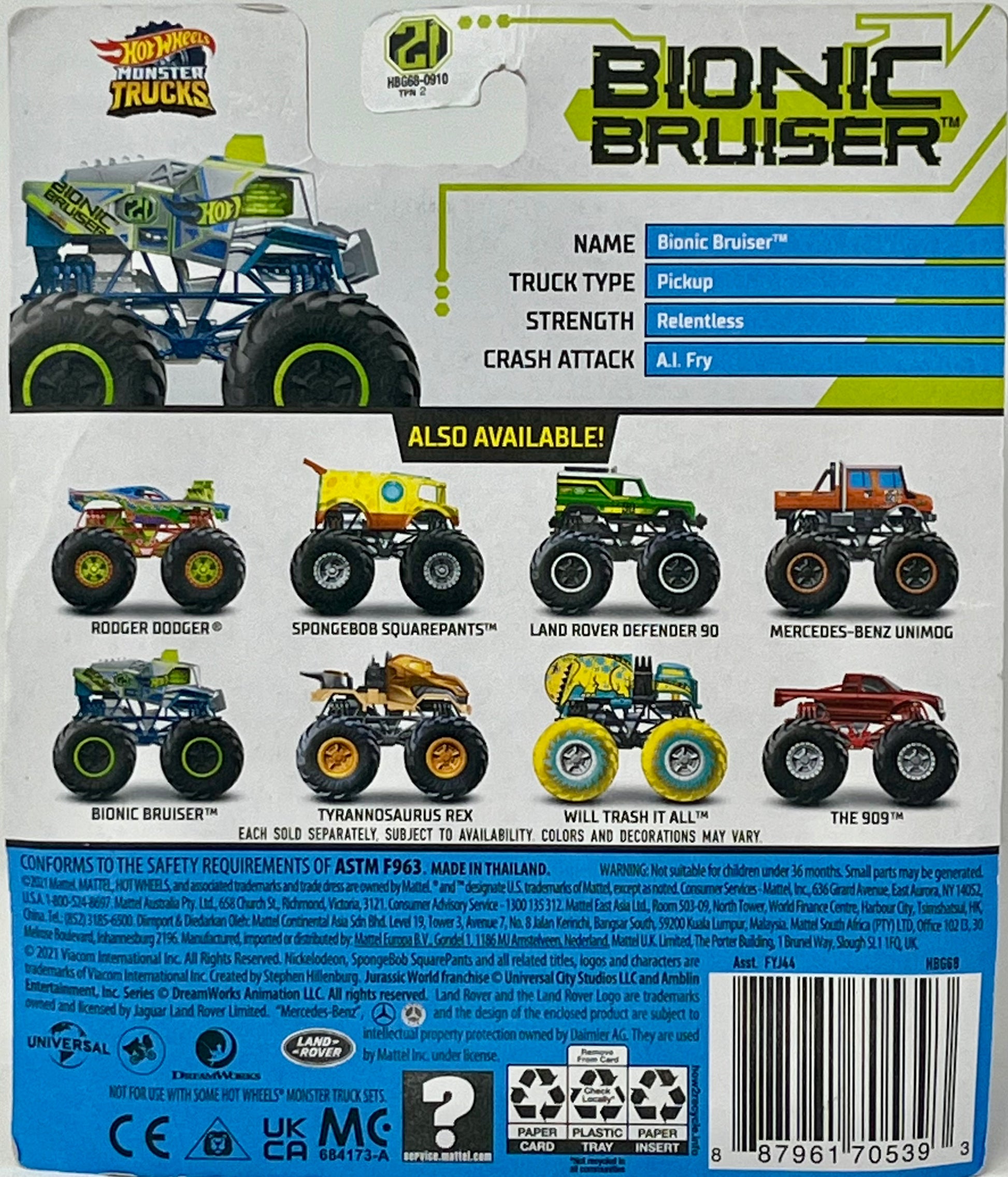 Introducing the latest addition to the Hot Wheels Monster Trucks Live series, the BIONIC BRUISER 2021! This multi-colored Monster Truck is a 1:64 scale die-cast model made with high-quality materials, perfect for collectors and kids alike. With a sealed package, the BIONIC BRUISER is in pristine condition and ready to be added to your collection.