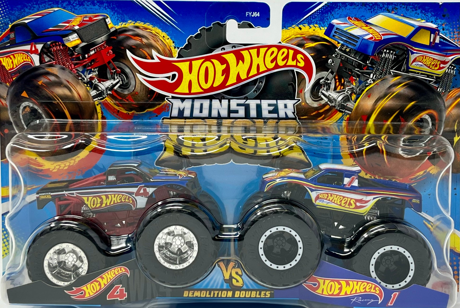 The Hot Wheels Monster Trucks 1:64 Scale Demolition Doubles two-packs double the action with two Monster Trucks ready to square off in head-to-head battles! Each of the two 1:64 scale vehicles have GIANT wheels and big personalities. The duos are purposely paired for epic crash attacks -- look for background and stats for each on the package, including name, truck type, strength, unique crash attack and motor-vation for great storytelling fun! Kids 3 years and older will want to collect them all!