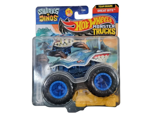 Dive into monster-sized action with the Hot Wheels Monster Trucks Great Bite from the Sharks vs. Dinos collection. This 1:64 scale toy truck is designed for thrilling crashes, wild stunts, and high-impact battles. Styled like a fearsome shark, Great Bite features oversized wheels, bold colors, and aggressive detailing that bring oceanic ferocity to the monster truck arena. Perfect for kids aged 3 and up, Great Bite is built tough with durable die-cast materials for long-lasting play. Whether collecting or creating shark vs. dino showdowns, this Hot Wheels Monster Truck delivers non-stop fun and fierce competition.
