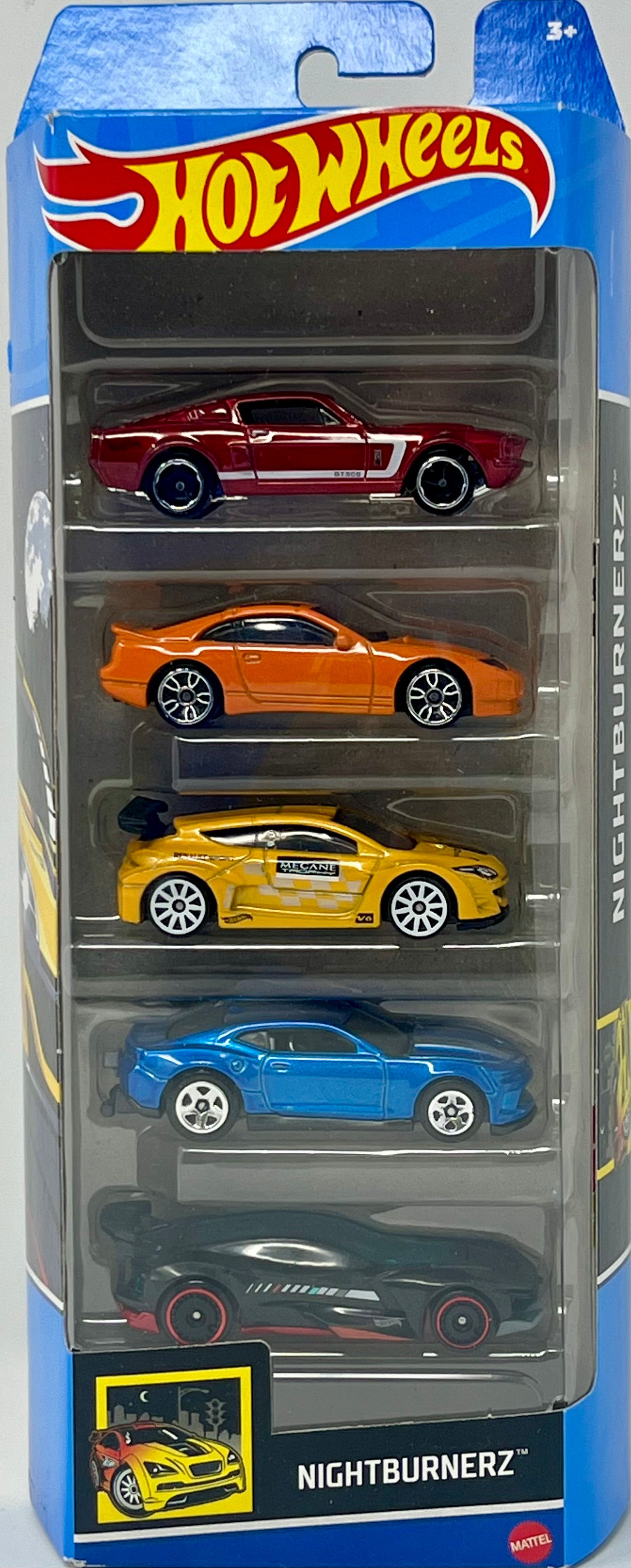 he Hot Wheels Nightburnerz 5 Pack features a collection of diecast cars, including the iconic'67 SHELBY GT500 • NISSAN 300ZX TWIN TURBO MEGANE TROPHY • 2018 COPO CAMARO SS • GAZELLA R. This set is part of the Hot Wheels Nightburnerz series and is designed in a 1:64 scale, ideal for collectors and enthusiasts alike. The vehicles are from the 2023 manufacture year and are branded under Hot Wheels, known for their high-quality and detailed toy car replicas. Perfect for fans of Cars and diecast vehicles, this 5 Pack offers a variety of models to add to any collection.