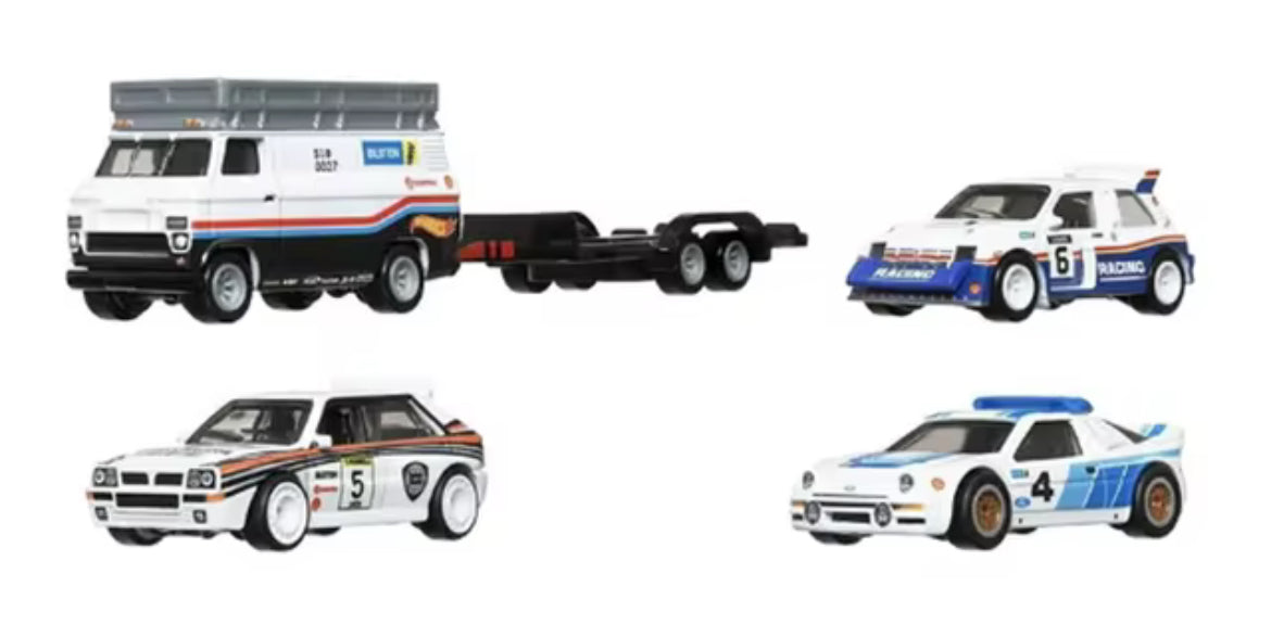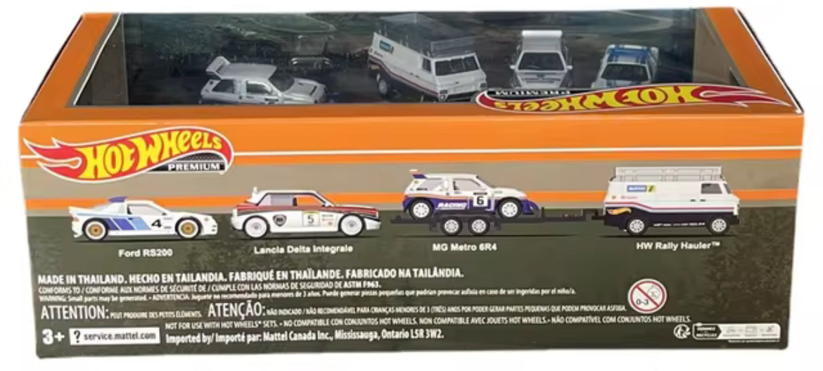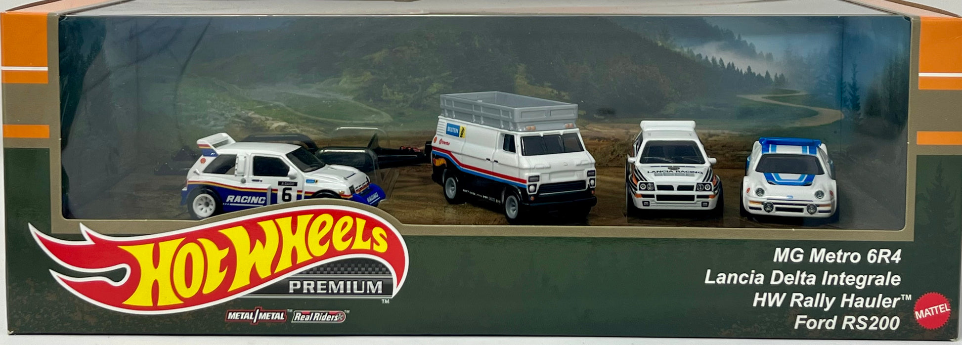 Hot Wheels Premium 1/64 Ford RS20 HW Rally Hauler Lancia Delta, MG Metro 6R4, HW Rally Hauler and Ford RS200