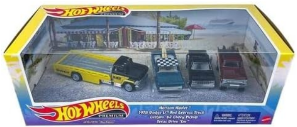 - Hot Wheels Premium Set Featuring 4 Trucks: Horizon Hauler, 1978 Dodge Express Truck, 62 Chevy Pickup + Texas Drive Em