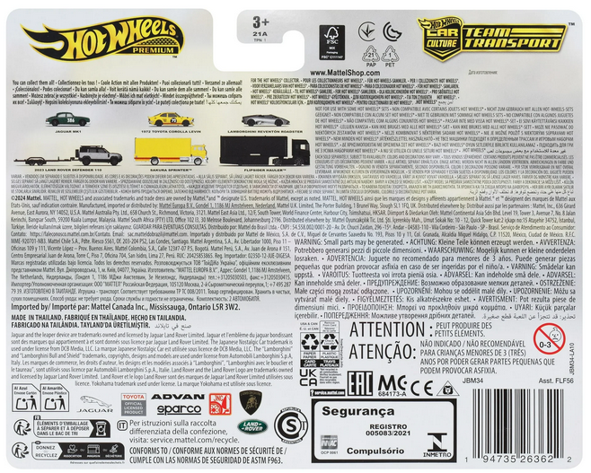 - Each set includes a 1:64 scale race car and its corresponding transport vehicle