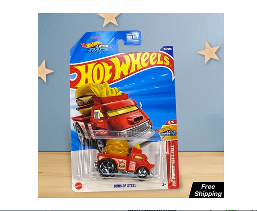 Rev up your collection with this striking red Hot Wheels Buns Of Steel die-cast car! Part of the exciting Let's Race series (5/5) and numbered 153/250, this 1:64 scale vehicle showcases meticulous attention to detail. The sleek design and vibrant red finish make this model a standout piece for both play and display. Perfect for collectors and young car enthusiasts alike, this die-cast car features the signature Hot Wheels quality and craftsmanship. Whether you're adding to your existing collection or starting a new one, this Buns Of Steel model delivers the thrilling Hot Wheels experience that fans love. The 1:64 scale makes it ideal for standard Hot Wheels tracks and displays, while its sturdy construction ensures hours of imaginative play.
