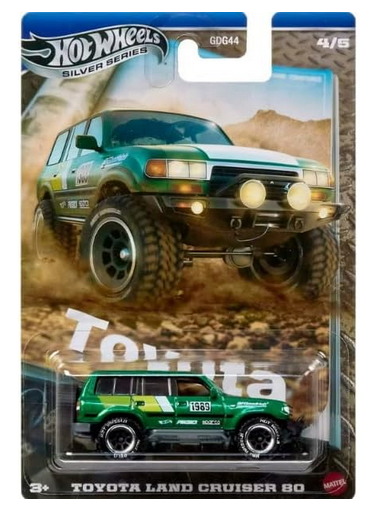 Bring home this stunning Hot Wheels Silver Series Toyota Land Cruiser 80 in eye-catching green! This 1:64 scale die-cast vehicle, part of the coveted Silver Series (4/5), captures the iconic SUV's rugged charm in exquisite detail. Crafted with premium die-cast metal construction, this collectible model showcases Mattel's commitment to quality and authenticity. Perfect for both play and display, this miniature Land Cruiser features manual operation and comes packaged in a collector-friendly box. The vehicle's compact size (packaging dimensions: 7 x 5 x 3 inches) makes it ideal for showcasing in your collection. Suitable for ages 3 years and up, this detailed replica brings the legendary Toyota Land Cruiser 80's legacy to life in miniature form. Please note: Contains small parts.