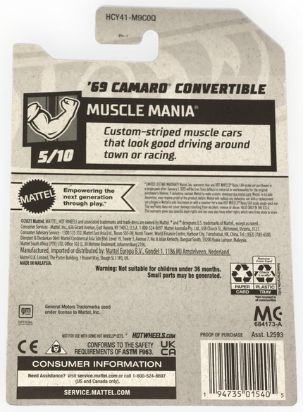 The Hot Wheels Zamac '69 Camaro Convertible from the Muscle Mania series is a meticulously crafted die-cast model that captures the iconic design and raw power of the classic '69 Camaro. Featuring a durable zinc alloy (Zamac) finish, this collectible showcases authentic muscle car details with a sleek convertible top. Ideal for serious collectors and enthusiasts, it offers both display appeal and lasting quality, making it a standout addition to any Muscle Mania lineup.