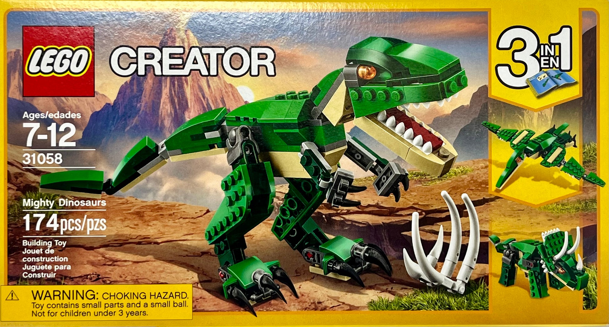 Kids aged 7-12 can roar into action with the mighty LEGO Creator Mighty Dinosaur (31058) 3in1 set. With this buildable dinosaur set, kids will have fun building the awesome T. rex toy, featuring a dark-green and beige color scheme, bright orange eyes, posable joints and head, large claws and an opening mouth with pointed teeth. Also includes the dinosaur’s prey in the form of a buildable rib cage. Kids can rebuild this 3in1 LEGO Creator Mighty Dinosaurs model to create a Triceratops toy or a Pterodactyl. LEGO Creator 3in1 toys are a great option for helping young ones enhance their imaginations or for collecting display sets that they can change to suit mood and space. This dinosaur building toy for kids aged 7-12 years old makes a great birthday or Christmas gift for young dinosaur fans. T. rex measures over 4 in. (11 cm) tall. Triceratops measures over 3 in. (9 cm) tall. Pterodactyl measures over 1 in. (4 cm) high, 7 in. (18 cm) long and 9 in. (25 cm) wide. Contains 174 pieces.