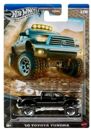 Add this sleek Hot Wheels '10 Toyota Tundra to your collection! Part of the prestigious Silver Series (1/5), this 1:64 scale die-cast replica showcases the iconic pickup truck in a striking black finish. Crafted with meticulous attention to detail using die-cast metal construction, this collectible vehicle captures the essence of the full-sized Tundra. Perfect for collectors and enthusiasts ages 3 and up, this manually operated model comes packaged in a display-ready box measuring 7 x 5 x 3 inches. The vehicle features authentic detailing and premium finishing that Hot Wheels collectors expect. Please note that this toy contains small parts.