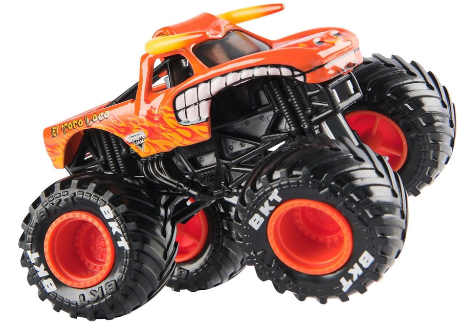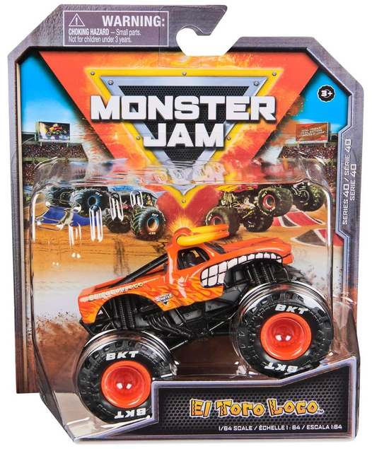 Monster Jam 2025 Official 1:64 Scale Diecast Truck Series 40 Crazy Creatures Series El Toro Loco (Orange). Introducing the all-new, official 1:64 scale die-cast Monster Jam monster truck! This lean, mean, Monster Jam machine features awesome graphics and details. With official BKT Tires, stylized rims, and an authentic chassis, this monster truck embodies the style and swagger of its real-life counterpart! Pull off epic stunts and jumps, just like you’ve seen in the live shows with your 1:64 scale toy truck. This die-cast Monster Jam truck is just like the real thing – only fun size! And now, with even more trucks to collect, including rare training trucks (toys each sold separately), unleash the epic Monster Jam action again and again! Plus, scan the QR code on the packaging to view the collector poster and keep track of your Monster Jam collection. Monster Jam monster truck toys are the perfect gifts for kids ages 3 and up. Bring home your favorite Monster Jam monster trucks and start building your collection today! Includes: 1 Monster Jam 1:64 Scale Monster Truck.