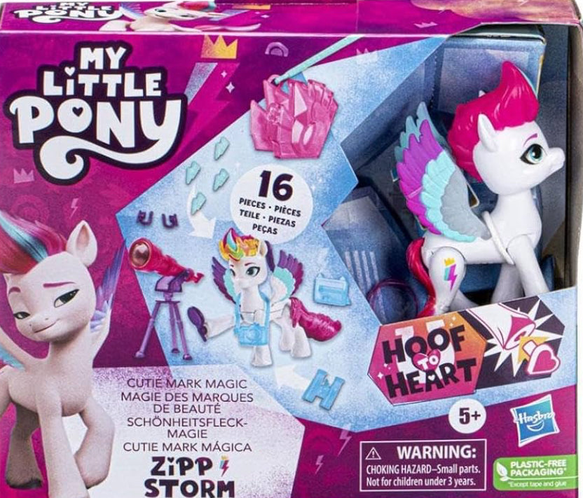 "Make Your Mark" with Zipp Storm: a Pegasus from Zephyr Heights! Zipp is a rebellious and athletic daredevil princess inspired by the My Little Pony: A New Generation movie and My Little Pony: Make Your Mark show. Includes a poseable 3-inch Zipp Storm pony figure with a plastic mane and soft tail. Figure has a lightning bolt Cutie Mark on one side, and a plug-in Cutie Mark charm for the other side! Reveal surprise story and style accessories, like charms for decorating her hair, and Hoof to Heart accessories she can hold in her hoof! Store them in the keychain for on the go fun. Also look for Cutie Mark Magic Pipp Petals, Sunny Starscout and Izzy Moonbow toys. All 3-inch Hoof to Heart figures are compatible with the Musical Mane Melody playset! (Figures and playset each sold separately. Subject to availability.) Makes a great holiday or birthday gift for kids ages 5 years old and up. My Little Pony and all related characters are trademarks of Hasbro.