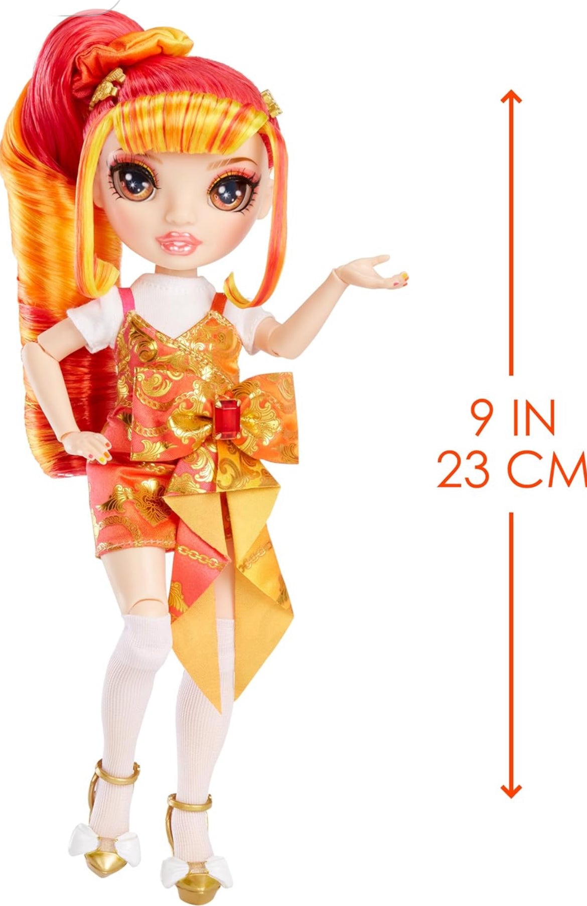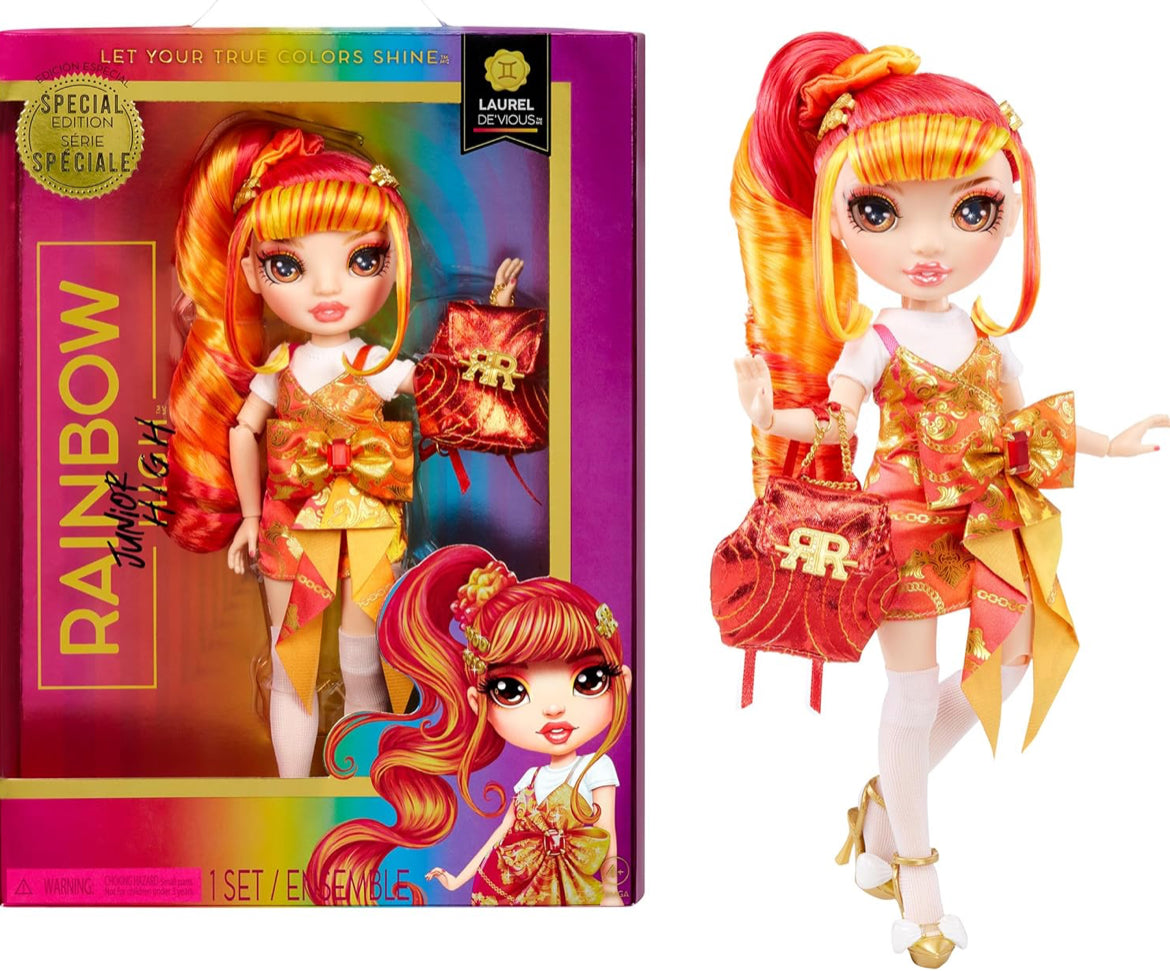 - GORGEOUS FEATURES: Laurel De’Vious is dressed head to toe in a red and orange. She has a gorgeous younger face sculpt, detailed features in her fashion, beautiful long red and orange pony tail with bangs, long eye lashes and glass eyes. Collect and play with all these fun and beautiful Rainbow Junior High fashion dolls.