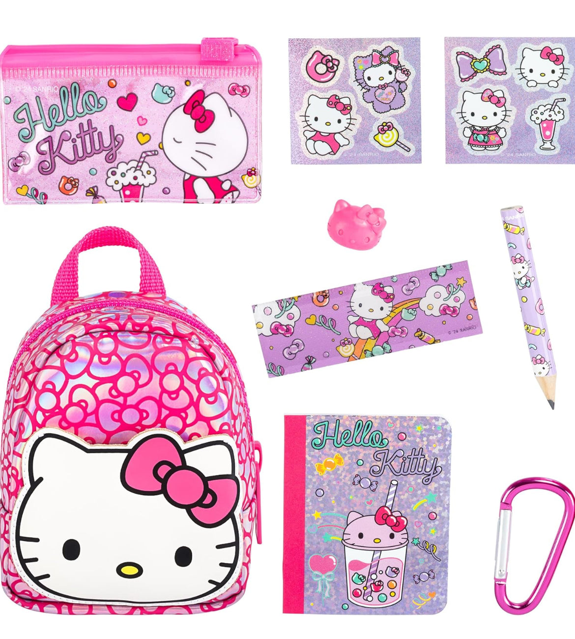 - Find 6 Sanrio Themed Surprises Inside Your Bags! Unzip and open the Backpack to reveal 6 of the cutest Sanrio themed stationery surprises inside! They all really work! Discover tiny Pencil Cases, Pencils, Paper Clips, Postcard Sets, Erasers, Stickers, Notebooks and more! Each surprise matches the Sanrio character on the Bag - Hello Kitty, Keroppi, My Melody!
